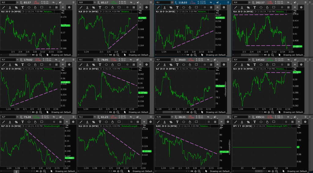 This next one is fun. I shared this chart setup of the last month of relative strength relationships across all S&P 500 sector ETFs vs SPY in my other post.