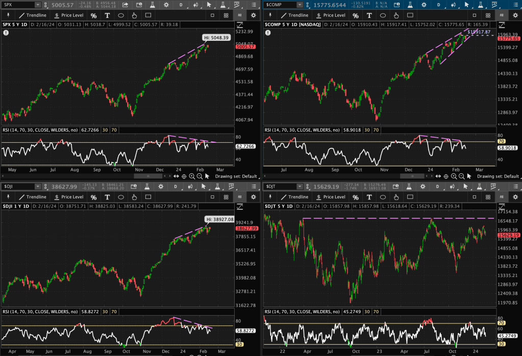 For example, a Bearish Divergence would be price making higher highs, but the RSI indicator making lower highs. You can see in each of the major indexes on the daily chart, all are making momentum divergences (S&P, Nasdaq, Dow Industrials, & Dow Transports).