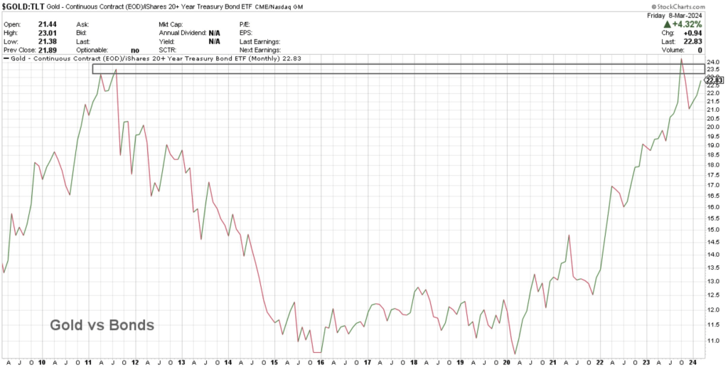 Since 2020, Gold has been outperforming Bonds – it continues to make higher highs and higher lows.