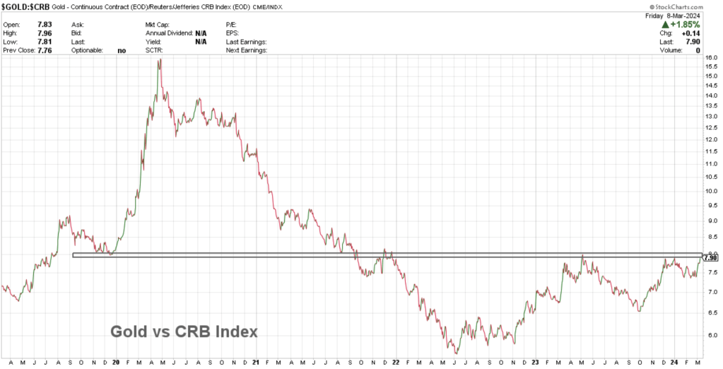 Using a 5-year weekly chart, you can see Gold is also approaching its resistance zone for outperforming other commodities. It typically has a history of leading overall commodity price levels.