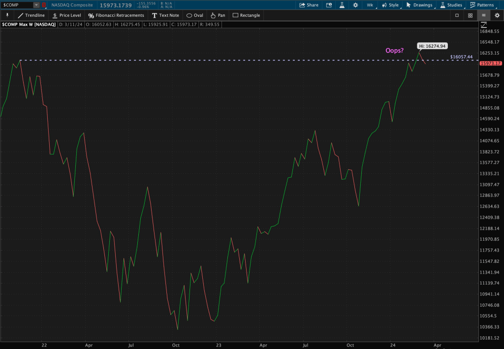 First, Technology (NASDAQ Composite) is back underneath its weekly close 2021 highs after its breakout last week, where it notched its highest weekly close in history at 16,275.