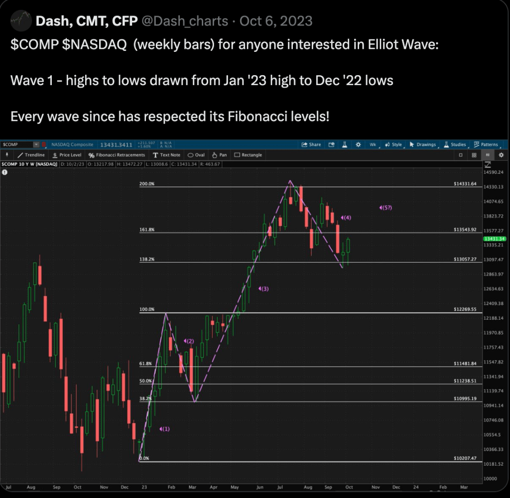 Now, looking at the Nasdaq in a bit of a different lens, using Elliot Wave Theory, we have seen the technology sector form “waves” or patterns within its ongoing trend. In October, I drew Fibonacci Retracement levels from January 2023 swing highs to bear market 2022 lows and shared this chart of the Nasdaq using Elliot Wave technique.