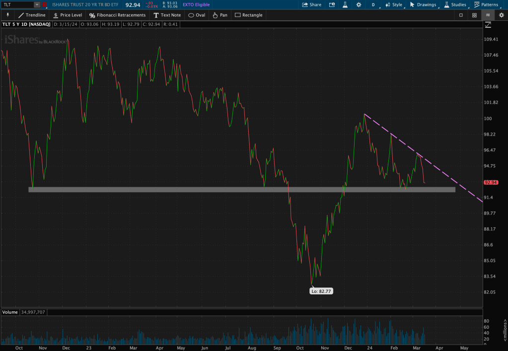 Using $TLT (20-year bond ETF) as a proxy for the Bond market – you can see that this week, Bonds experienced a resistance bounce off of their valid descending trendline resistance level before quickly moving back towards horizontal trendline support.
