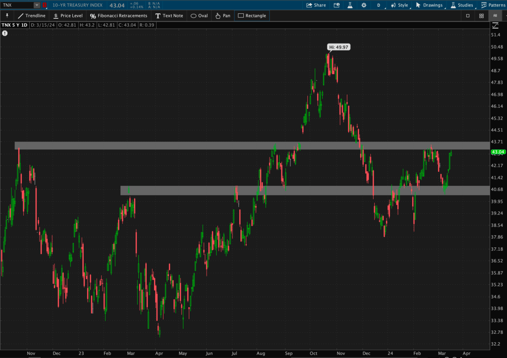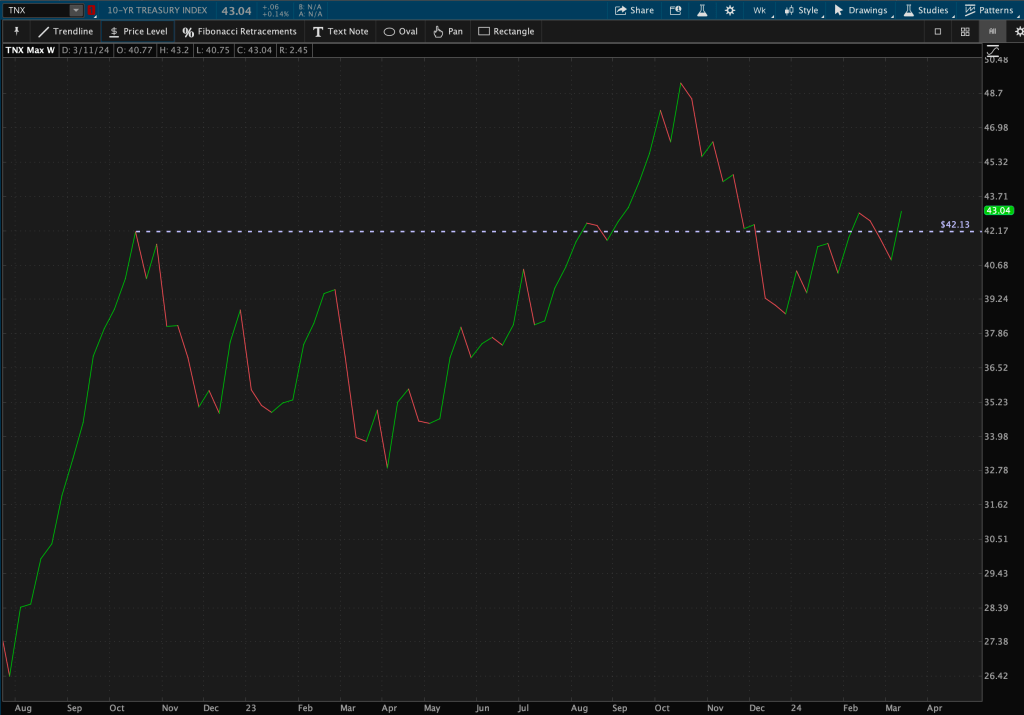 Using a weekly chart with closing prices, you can see that the $TNX has had the highest weekly close since October of 2022.