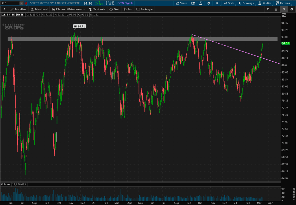 First, on Monday, $XLE broke out from its valid descending trendline resistance level. Afterwards, it rapidly made its way towards its near 2-year long horizontal resistance level.