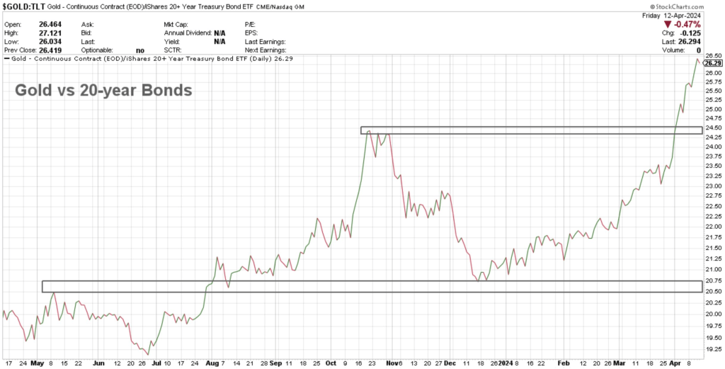 Last month, I outlined some relative strength relationships between gold and various asset classes, where I included various levels to watch: https://dash-charts.com/2024/03/10/can-gold-outperform/
